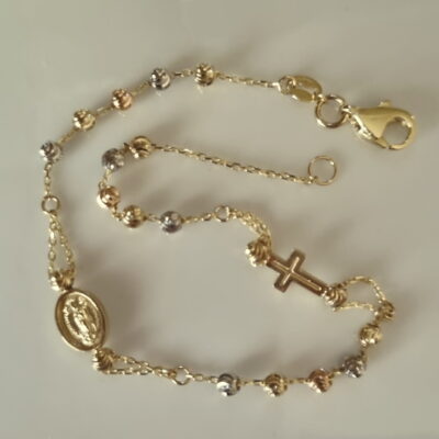 9ct tri Gold bracelet diamond cut beads Cross Medal