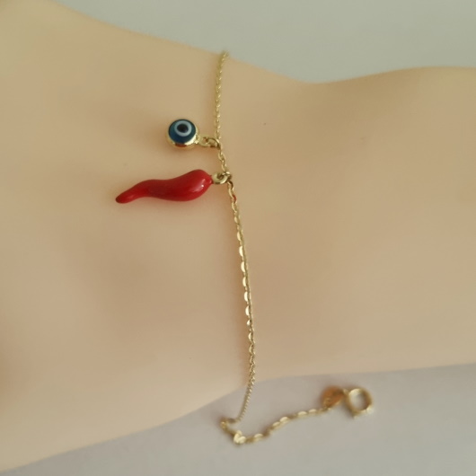9ct Gold bracelet cornicello red chilli evil eye.