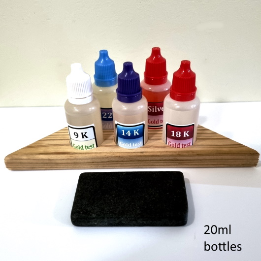 5 bottles 9K, 14K, 18K, 22K, Silver, a Lydian testing stone and wooden stand with detailed instructions.